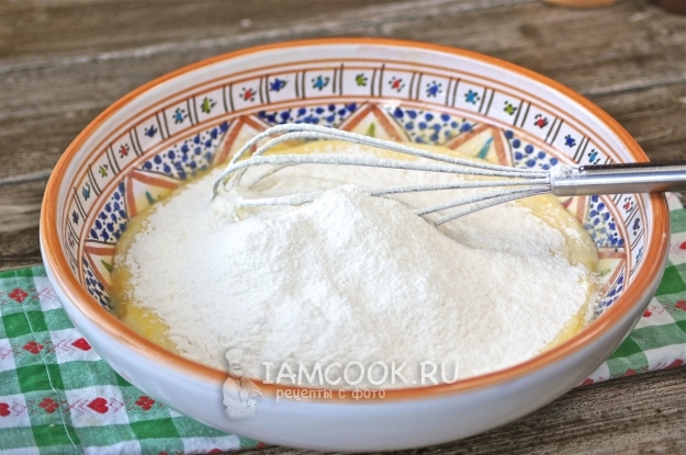 Добавьте разрыхлитель, растопленное сливочное масло, вбейте яйцо и размешайте венчиком.