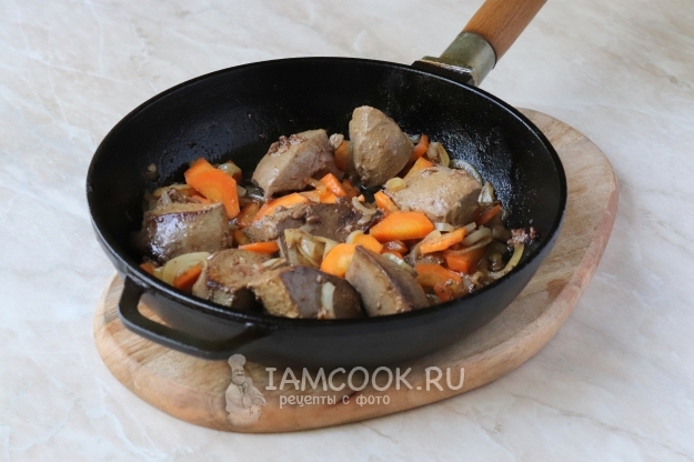 Промыть холодной водой несколько раз, затем замочить в воде с уксусом на 30 мин, потом промыть, посолить, посахарить и залить соевым соусом на час. Затем смыть соль и сахар, и положить в обжаренные лук и морковь. Потушить все вместе 10-15 минут. Печень мягкая и душистая!!! Можно есть с любым гарниром.
