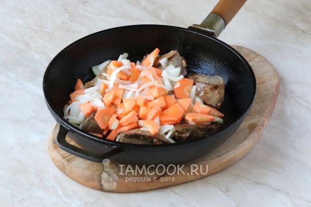 Тем временем очистить овощи. Лук нарезать полукольцами, морковь - тонкими ломтиками или брусочками. Овощную нарезку добавить к печени.