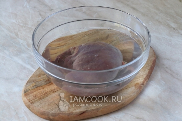 Свиную печень замочить в холодной воде и оставить на 30 минут.