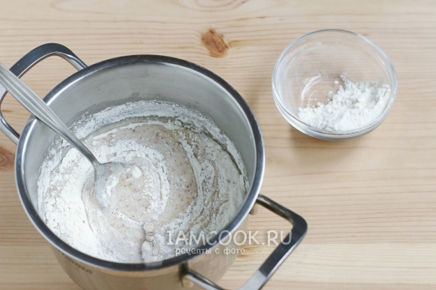 Снимаем с огня и даем чуть остыть, сразу всыпаем муку и перемешиваем.