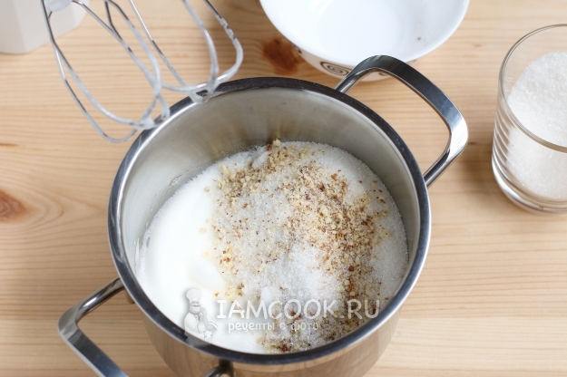 Испеченный корж оставляем на столе остывать, а в это время приготовим миндальный слой для печенья. Белки взбиваем в крепкую пену сразу в небольшой кастрюльке, добавляем к ним перемолотые орехи миндаля и сахар. Ставим на огонь и, помешивая, доводим массу до кипения.