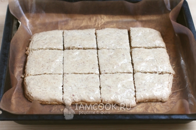 Достаем из духовки испеченный корж с миндальным слоем и горячим разрезаем на квадраты. Горячее печенье будет легко нарезаться, но если вы прозеваете и оно остынет, то нарезать уже не получится - печенье будет ломаться, поэтому нарезайте сразу!