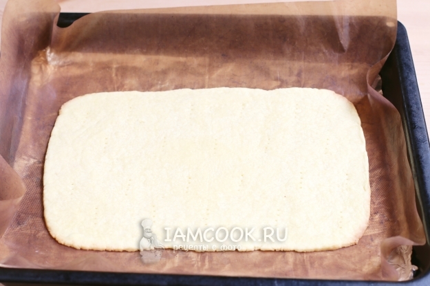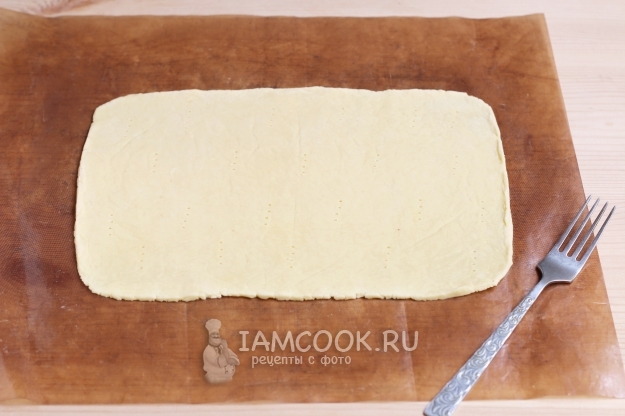 Достаем тесто и раскатываем в тонкий прямоугольник толщиной примерно 3-4 мм, накалываем часто вилкой, чтобы при выпекании оно не вздувалось. Отправляем в духовку выпекаться.