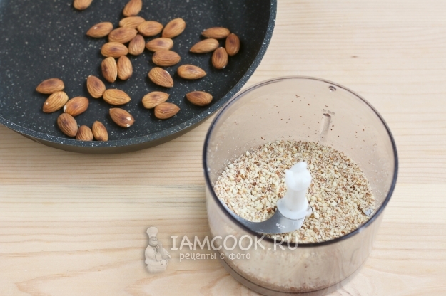 Пока тесто находится в холодильнике, поджарим немного миндаль в сухой сковороде - до появления приятного орехового аромата. После остудим и измельчим блендером в мелкую крошку. Разогреем духовку до 200 градусов.