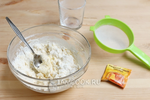Теперь просеиваем в миску пшеничную муку с разрыхлителем, перемешиваем все ложкой.
