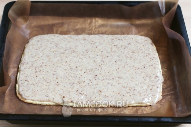 Получившуюся массу распределяем по песочному коржу и даем минут 10 постоять. После отправляем противень с заготовкой в духовку с температурой 160 градусов и печем 25-30 минут.