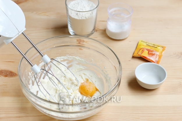 Затем добавляем во взбитое масло с пудрой куриный желток и соль, снова взбиваем примерно минуту.