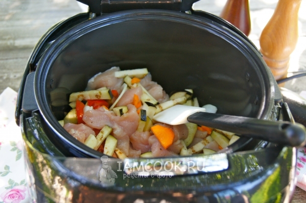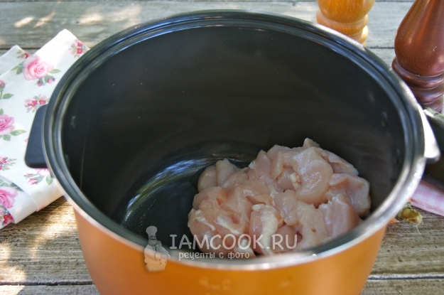 Промойте куриное филе, обсушите и нарежьте на небольшие кусочки, выложите в чашу мультиварки.