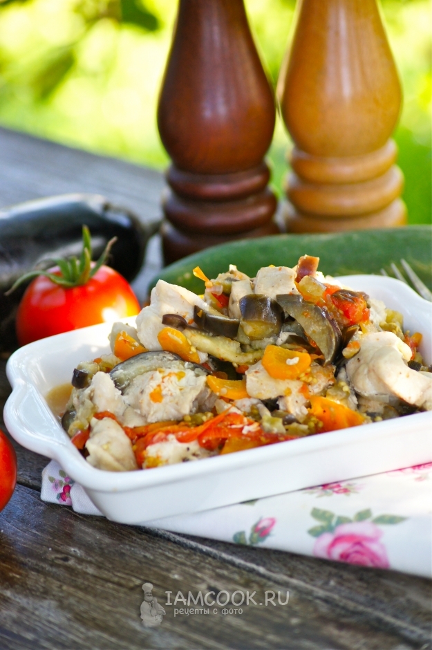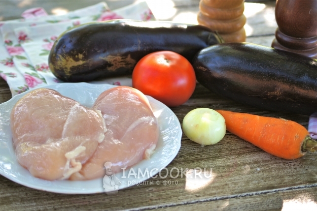 Итак, сначала подготовим все необходимые ингредиенты для приготовления баклажанов с курицей в мультиварке.