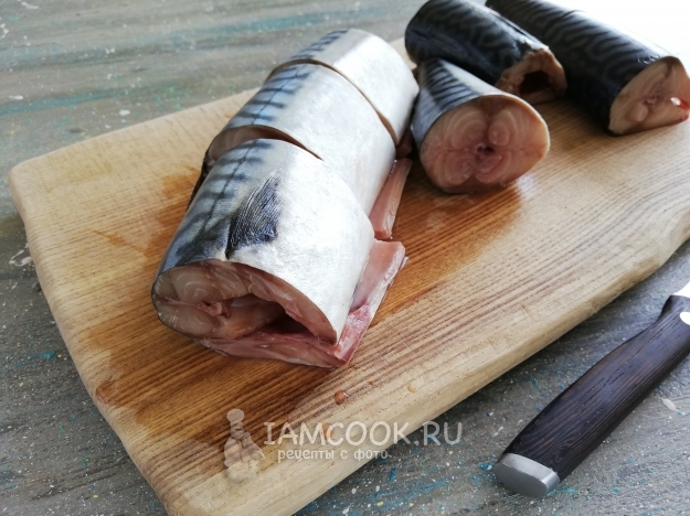 Первым делом необходимо рыбу помыть и почистить. Убрать из брюшка черную пленочку, чтобы скумбрия не горчила. Хвост и голову отрезаем (как вариант из них можно сварить рыбный бульон). Режем рыбу на крупные куски.