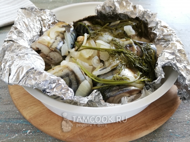 Теперь на емкость для варки на пару кладем фольгу, на нее - скумбрию. Посыпаем рыбу солью и перцем по вкусу. Сверху укладываем лук и укроп. Закрываем фольгой. Фольга не даст соку вытечь. Бонус - чистая мультиварка.