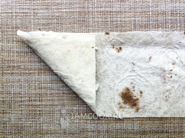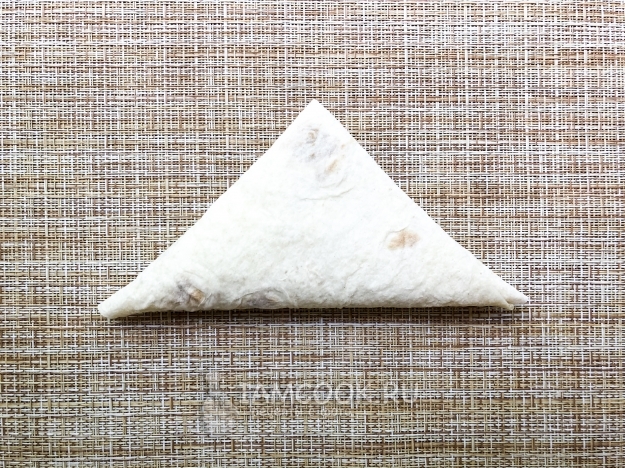 Аккуратно загните треугольник с начинкой наверх. И продолжайте заворачивать до конца полоски.