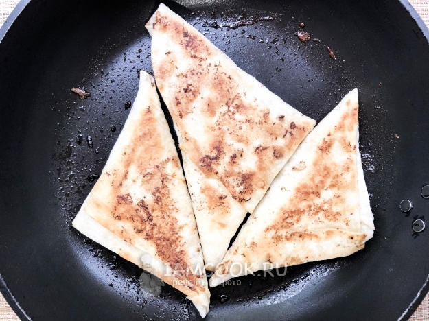 Растопите сливочное масло на сковороде, выложите треугольники швом вниз и обжарьте до золотистой корочки с обеих сторон.
