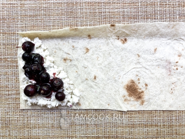 Лист лаваша разрежьте на 3 длинные полоски. Выложите на каждую по 1/3 части творога, варенья и ягод, чтобы получился треугольник, как на фото.