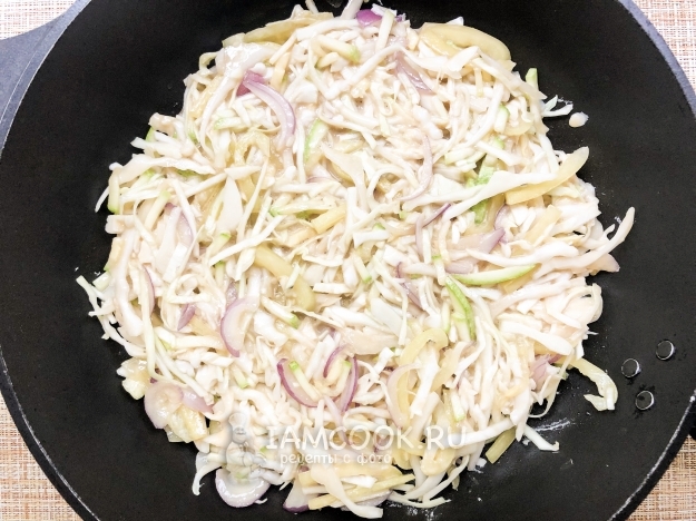 Разогрейте подсолнечное масло на сковороде и выложите капустную смесь ровным слоем. Накройте крышкой и готовьте на низком огне до золотистой корочки.