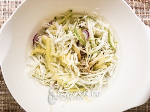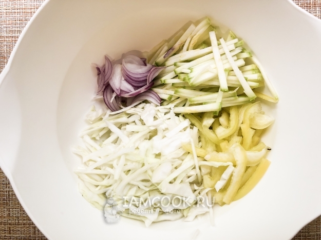 Нарежьте тонкой соломкой капусту, болгарский перец, кабачок, лук и перемешайте.