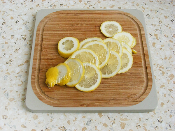 Лимон помыть и порезать тонкими колечками.