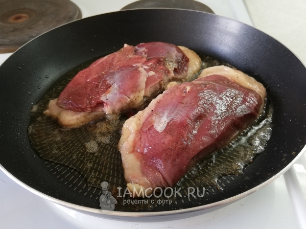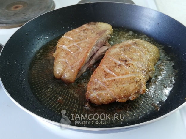 Теперь необходимо грудку обжарить - в итоге с двух сторон получится корочка, которая не даст вытечь соку из мяса. Для этого на холодную сухую сковороду кладем утиную грудку кожей вниз. И жарим на среднем (или чуть больше) огне примерно 5 минут. За это время должно выделиться много жира и образуется зажаристая корочка.