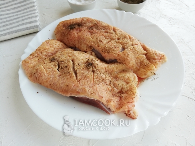 На коже делаем надрезы - как бы ромбиками, так, чтобы не порезать мясо. Это делается для того, чтобы жир вытопился быстрее и в большем объёме. Затем солим и перчим с двух сторон по вкусу.