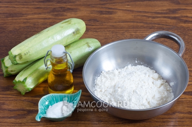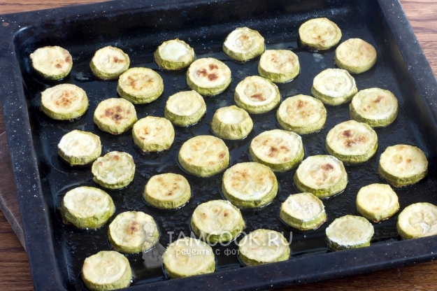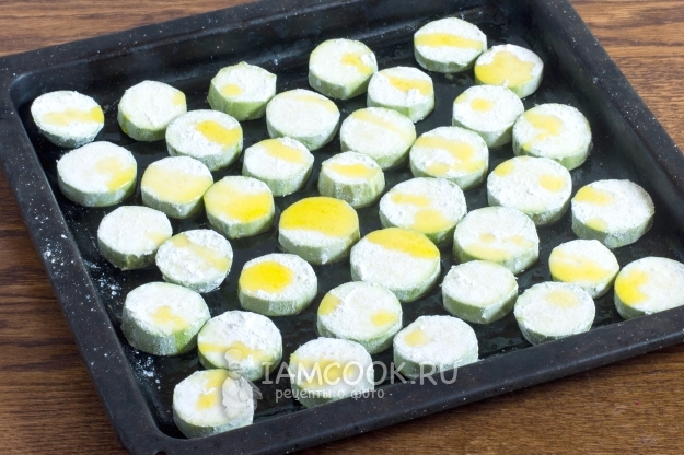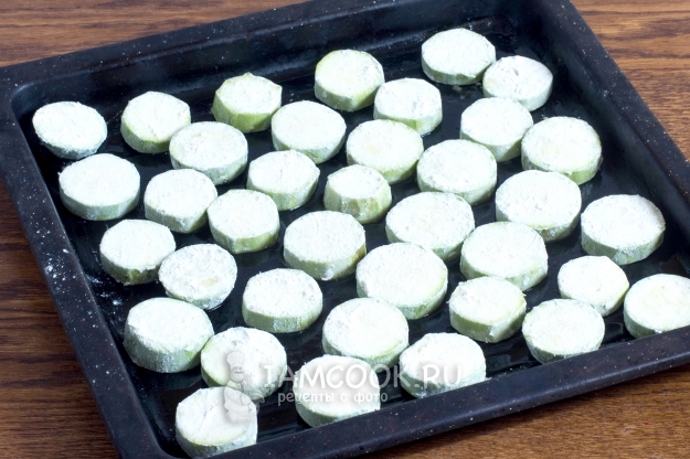 Противень смажьте растительным маслом. Кружочки кабачков обваляйте в муке и выложите на противень в один слой. Посолите.