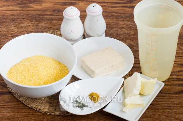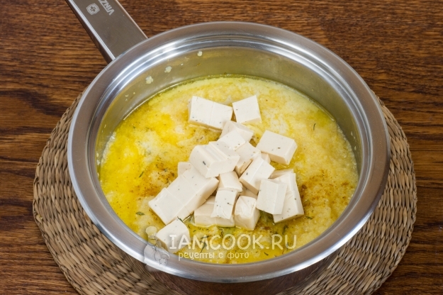 В готовую кукурузную кашу добавьте карри, тимьян, черный молотый перец, сливочное масло и нарезанный небольшими кубиками плавленый сыр.
