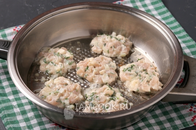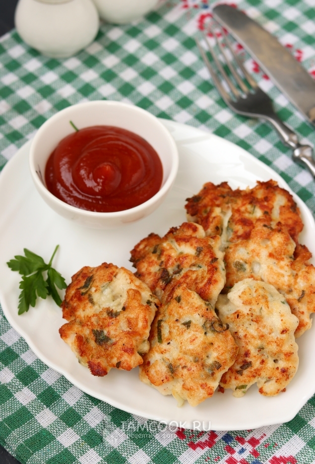 Подать готовые оладьи из куриной грудки с сыром к столу с любимым соусом.