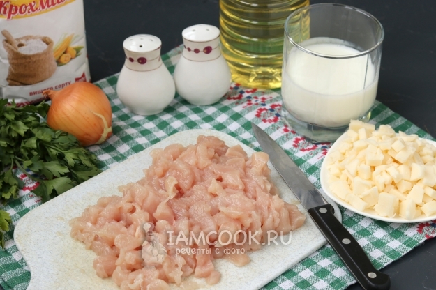 С куриной грудки снять кожу, удалить кости и нарезать мясо мелкими кубиками. Сыр нарезать кубиками такого же размера.