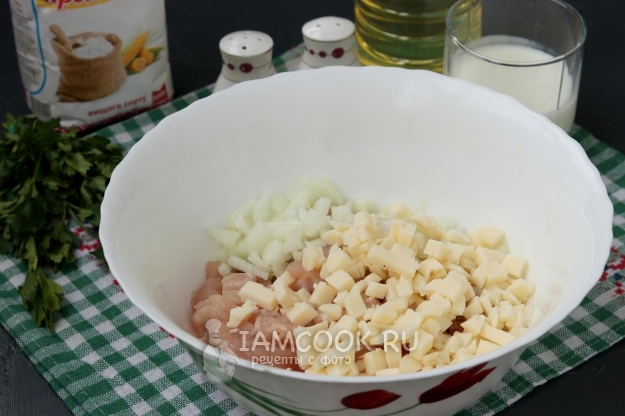 Нарезать мелким кубиком лук. Сложить мясо, сыр и лук в глубокую миску.