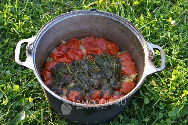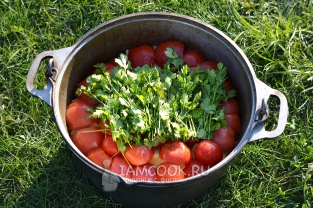 На картошку выкладываем томатные половинки. Чуть-чуть соли и завершающий ингредиент - зелень кинзы. Я ее не режу, а сразу кладу пучком, а перед подачей блюда убираю. Добавляем стакан воды.
