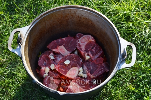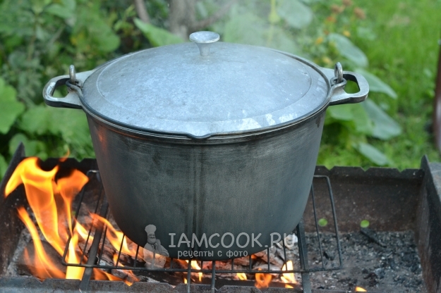 Закрываем казан крышкой. Ставим на огонь на 2 часа. Сначала казан у нас нагревается, а затем можно слегка убрать нагрев и поддерживать на среднем.