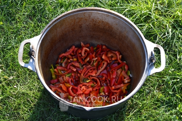 Сладкий перец нужно порезать тонкими дольками или кубиками.