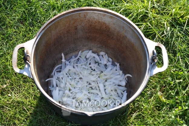 Итак, берем казан. Репчатый лук нарезаем тонкой соломкой. Выкладываем на дно.