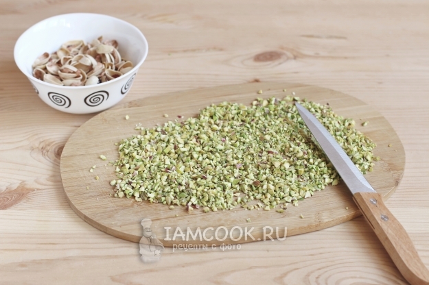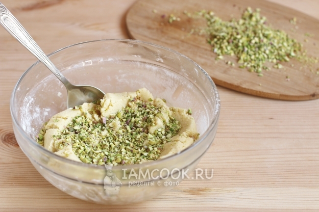 Достаем тесто из холодильника и вмешиваем в него фисташки, оставим совсем немного для посыпки печений сверху.