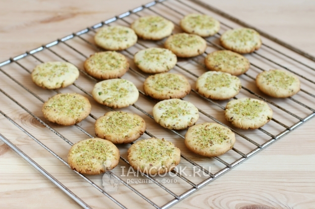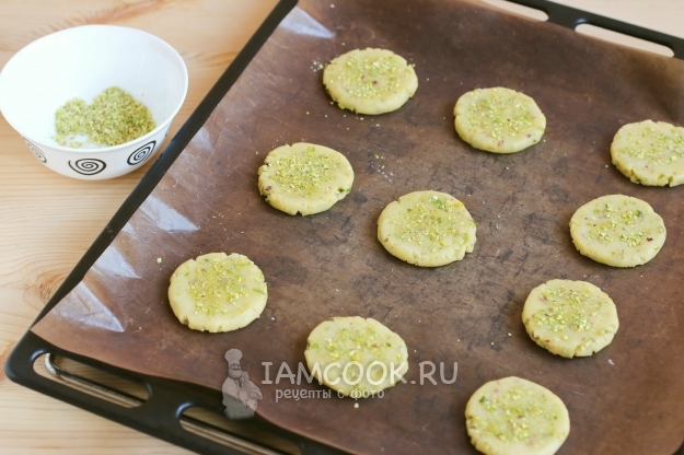Каждое печенье посыпаем измельченными фисташками и ставим в разогретую до 190 градусов духовку, печем 10-12 минут.