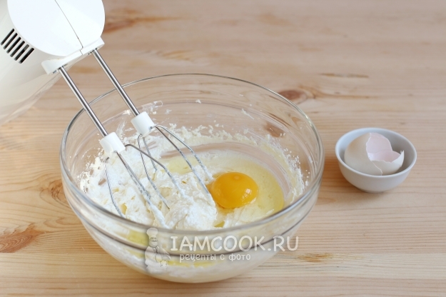 Добавляем к масляной смеси куриное яйцо и продолжаем взбивать еще минуту до объединения ингредиентов.