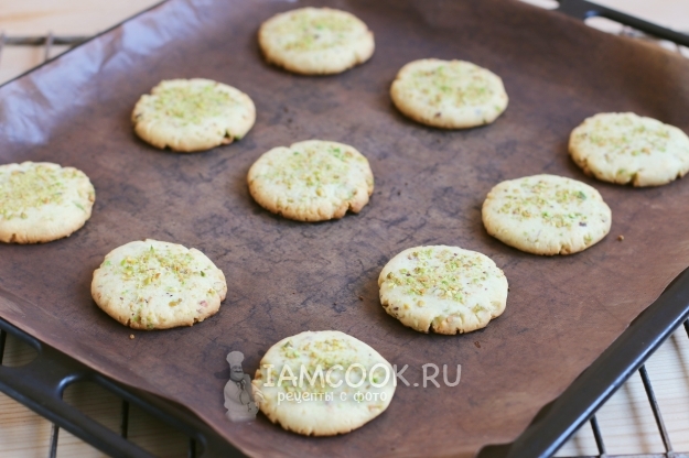 Такое печенье из песочного теста не нужно долго выпекать, оно должно остаться светлым. Достаем противень с фисташковым печеньем, быстро снимаем с коврика. Даем противню остыть, после чего формируем печенье из оставшегося теста и выпекаем вторую партию.