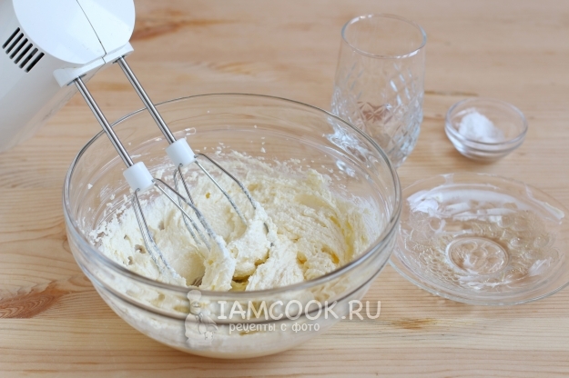 Размягченное масло взбиваем миксером вместе с сахаром и щепоткой соли до посветления и пышности, примерно три минуты.
