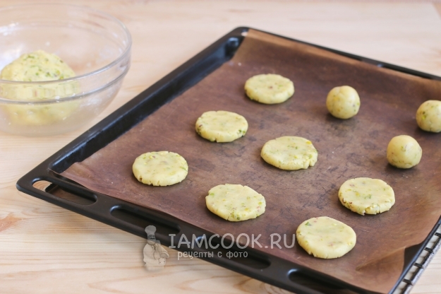 Делим тесто на шарики одинакового размера, раскладываем на противне и расплющиваем каждый шарик в лепешечку. Я выпекала печенья в два захода, так как за один раз все печенья не поместились на противне.