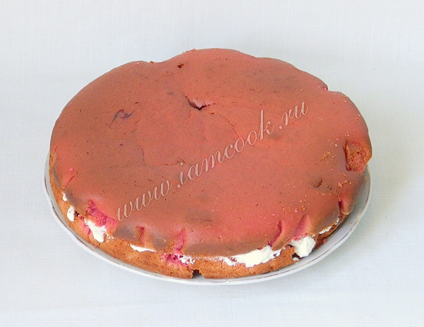 Охлажденный бисквит делим на два коржа и обильно прослаиваем кремом.