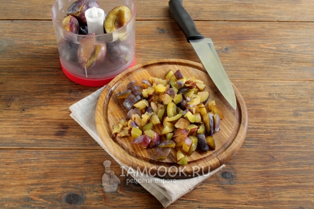Сливовую мякоть рубим. Можно орудовать ножом, измельчая сливы небольшими фрагментами. Можно запустить кухонный агрегат с насадкой "нож". Варка длится всего 15 минут, поэтому необходимо оперативно пустить сок. Мелкие кусочки в этом случае — то что нужно.