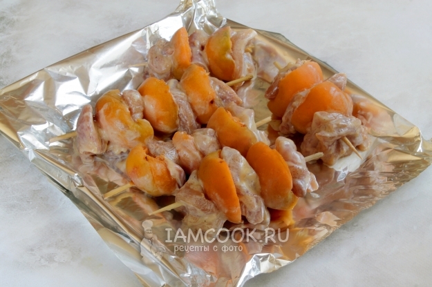 Нанизываем куриные куски, чередуя с абрикосовыми половинками, на шпажки. Укладываем на лист фольги и отправляем в раскаленную к тому моменту духовку. Запекаем шашлычки при температуре 190-200 градусов примерно 10-15 минут, один-два раза переворачиваем.