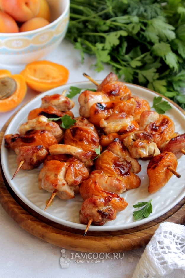 Подаем вкусные, сочные и нежные куриные шашлычки с абрикосами горячими. Можно даже без соусов.