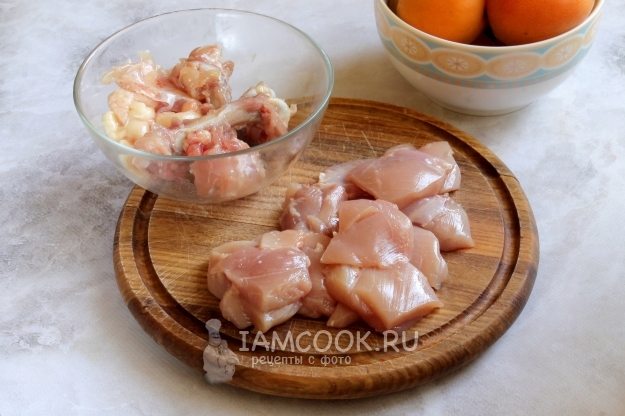 Отделяем мясо от кости, лишнего жира, кожи. Затем филе нарезаем кубиками примерно одинакового размера.