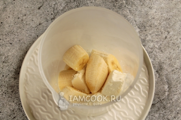 В емкость блендера опускаем творог и кусочки банана. Чем спелее, слаще фрукт, тем вкуснее.