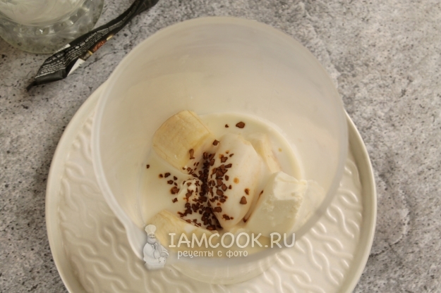 Вливаем питьевой йогурт или кефир, бросаем примерно 0,5 ч.л. растворимого кофе.