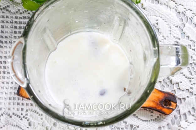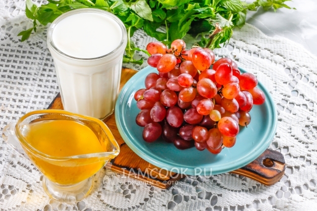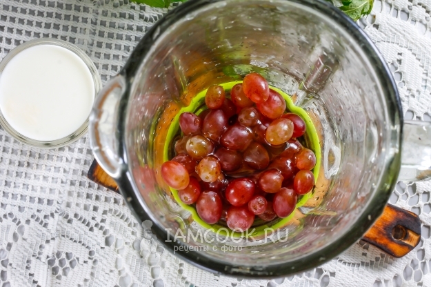 Йогурт лучше всего приобрести без наполнителей и добавок, что-нибудь наподобие Активии. Идеальным вариантом будет йогурт, созданный в домашних условиях из молока. Если же его нет, то допустимо создать смузи на кефирной основе или на ряженке. Молоко не используйте - оно расслоится при перемешивании с измельченной виноградной массой.