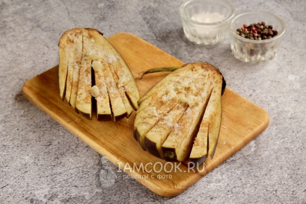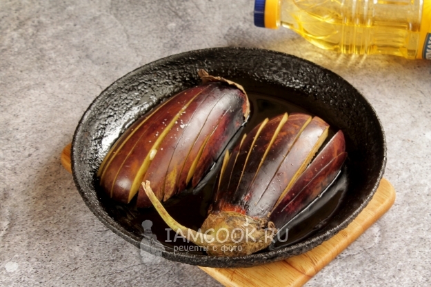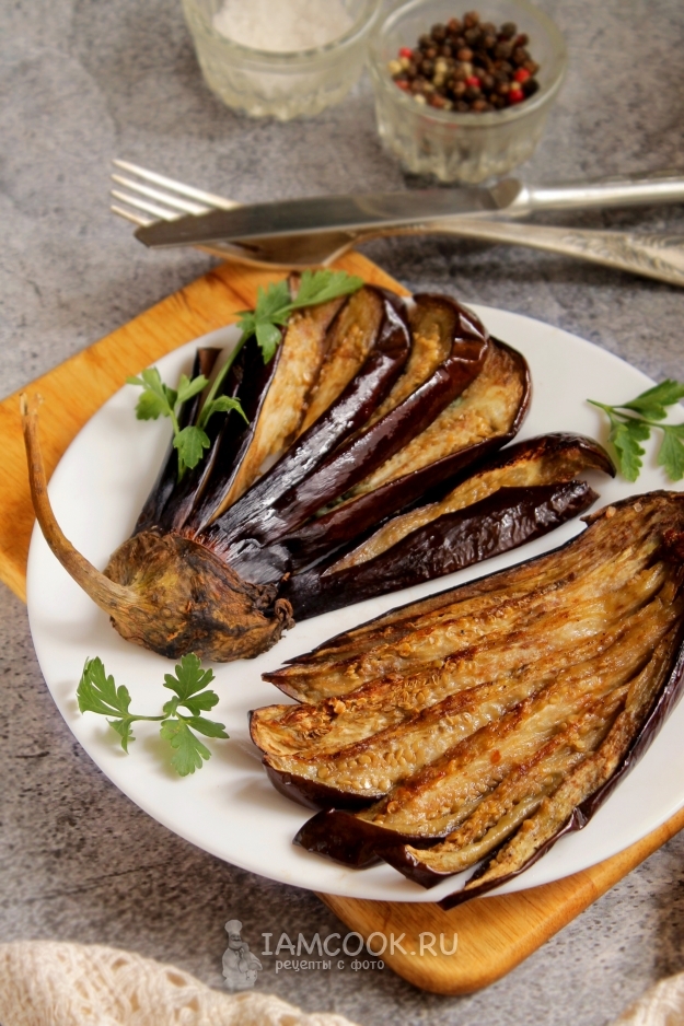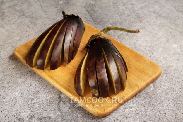 Подаем запеченные веером баклажаны горячими или остуженными, самостоятельно или в качестве закуски/овощного гарнира.
