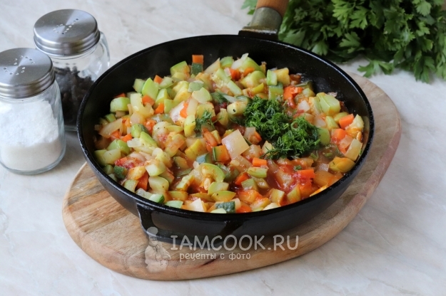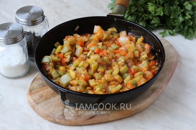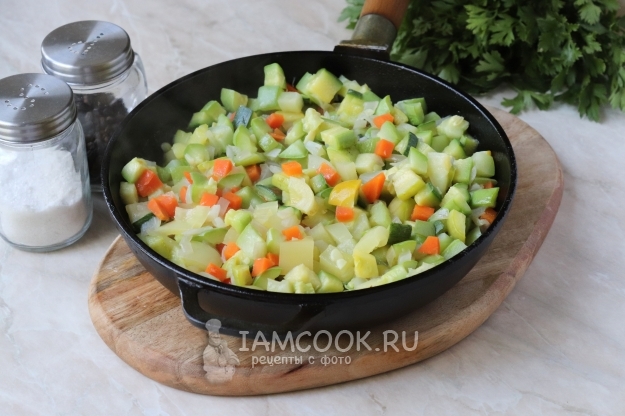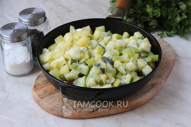 После чего к обжаренным овощам добавить замороженные кабачки и нарезанный произвольными кусочками болгарский перец.