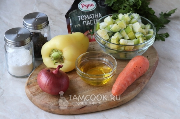 Для приготовления икры из замороженных кабачков подготовить продукты по списку к рецепту.
